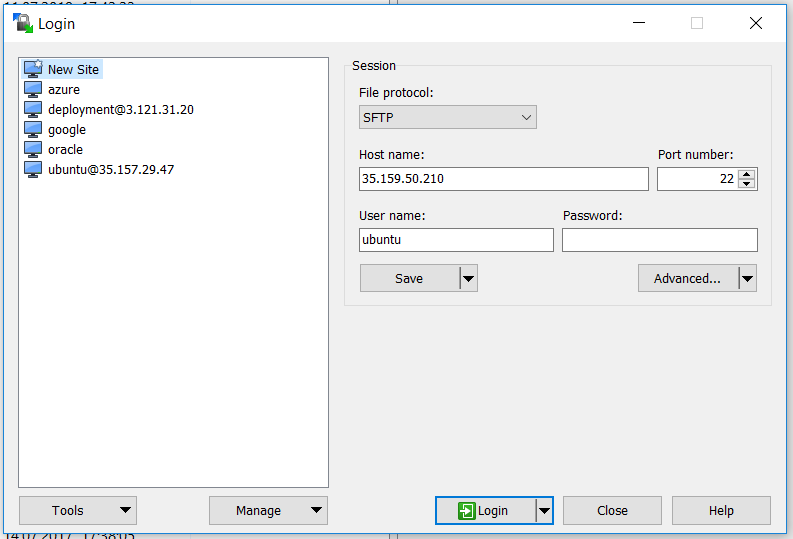 2. Choose SFTP as File protocol and enter the public IP address of your instance and 'ec2-user' as username.