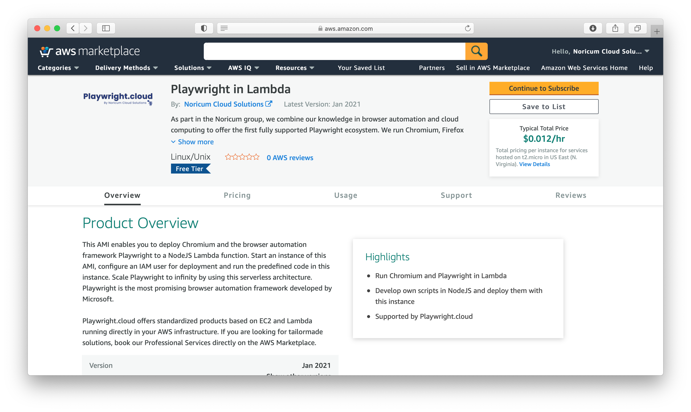 1. Go to the listings page Playwright in Lambda on AWS Marketplace.