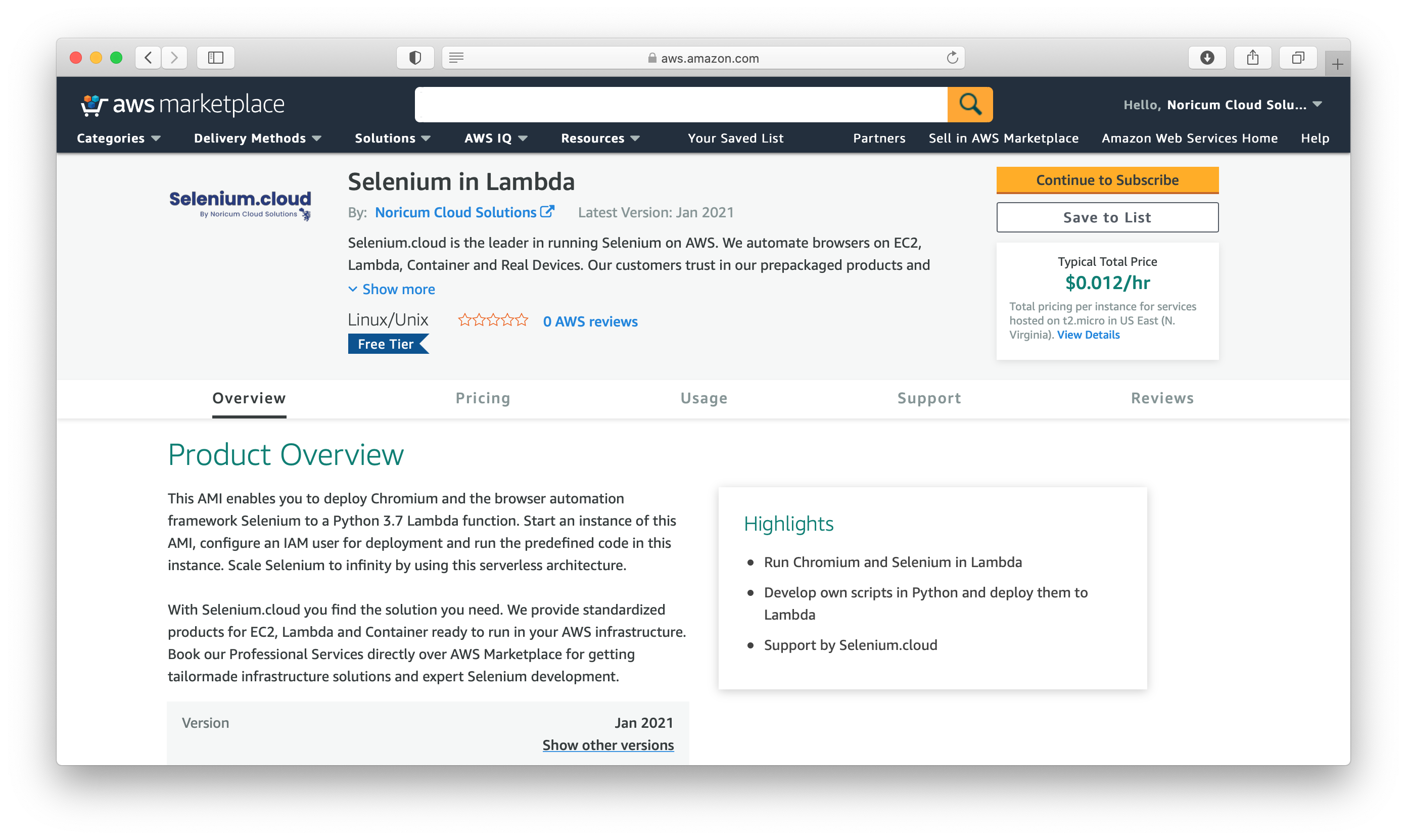 1. Go to the listings page Selenium Webdriver in Lambda on AWS Marketplace.