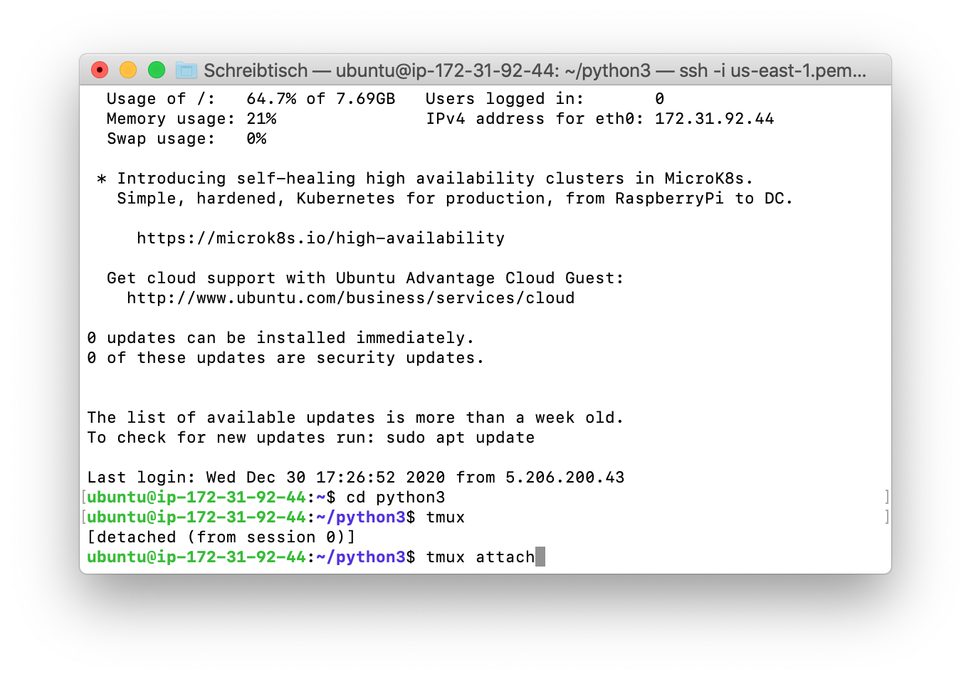 To detach the tmux session while keeping your script running in the background, press CTRL+b followed by d. You can now safely close the SSH session; your script will continue to run inside tmux.