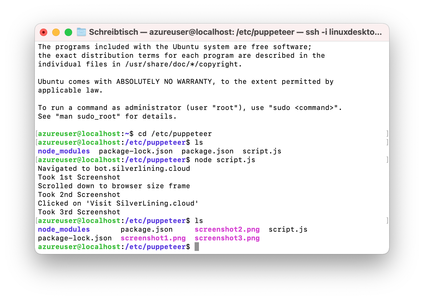 Connect to the terminal via SSH by logging in with your created user account (the default username is 'azureuser'). For guidance, refer to the chapter titled 'Connect to Your VM via SSH'.