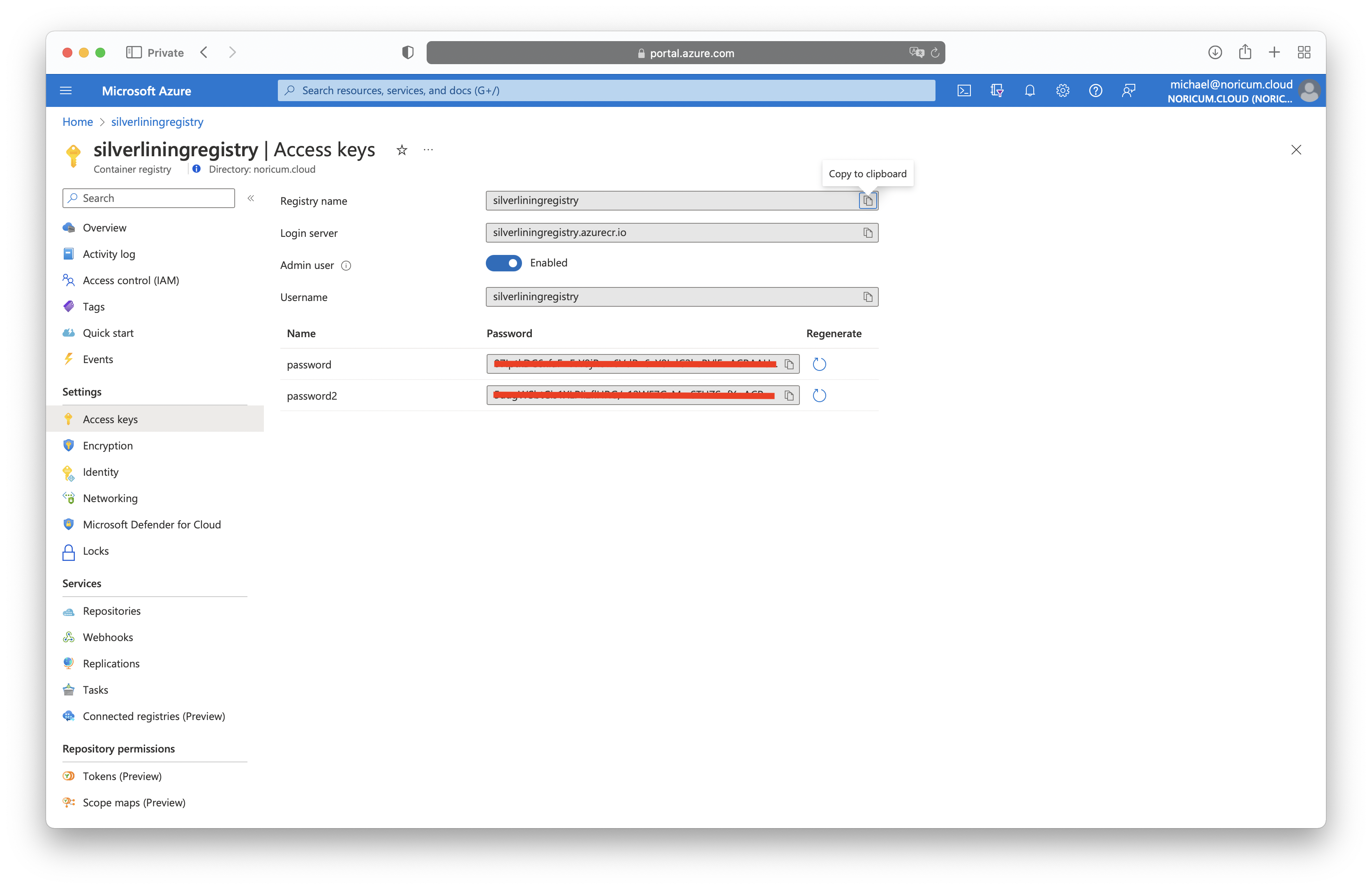 7. Go to the Azure portal and open the created container registry. Click on 'Access keys' and enable 'Admin user'. Save the username and one password for the next step.