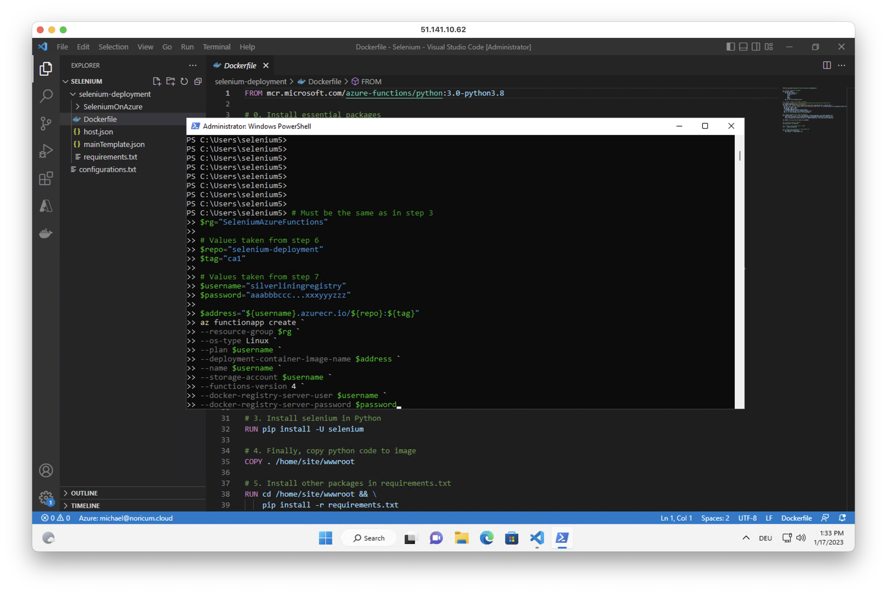 az login cd C:\Selenium\selenium-deployment $rg="SeleniumAzureFunctions" $loc="eastus" $image_name="SeleniumAzureFunctionsImages" az group create ` --name $rg ` --location $loc az deployment group create ` --name $image_name ` --resource-group $rg ` --template-file mainTemplate.json