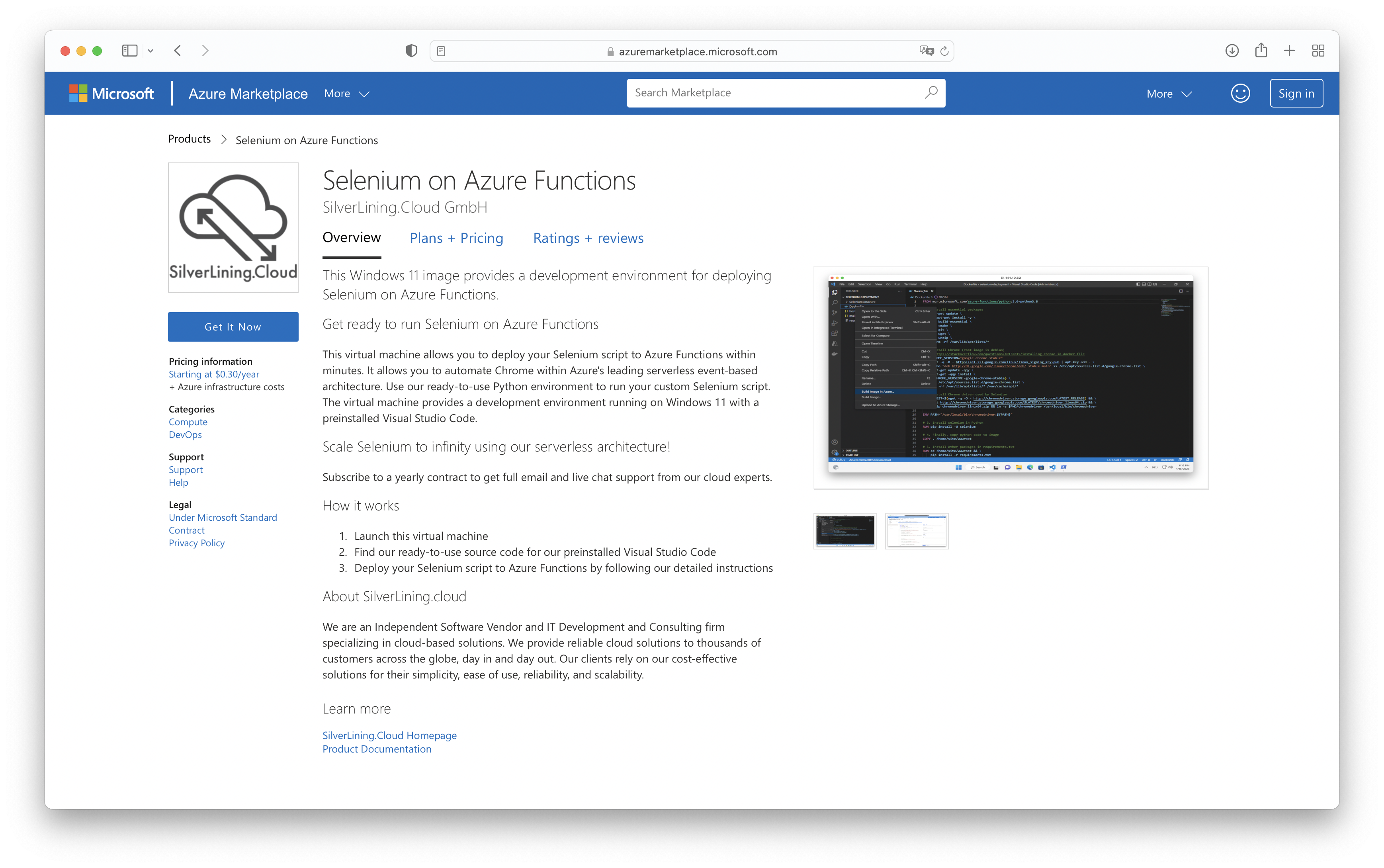 1. Go to the listings page Selenium Webdriver on Windows on Azure Marketplace.